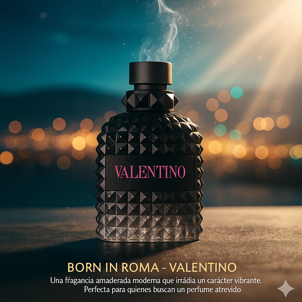 Valentino Born in Roma (80 ml): Moderno y versátil, combina notas de vainilla, jengibre y maderas. Perfecto para transmitir frescura, juventud y energía en cualquier ocasión.